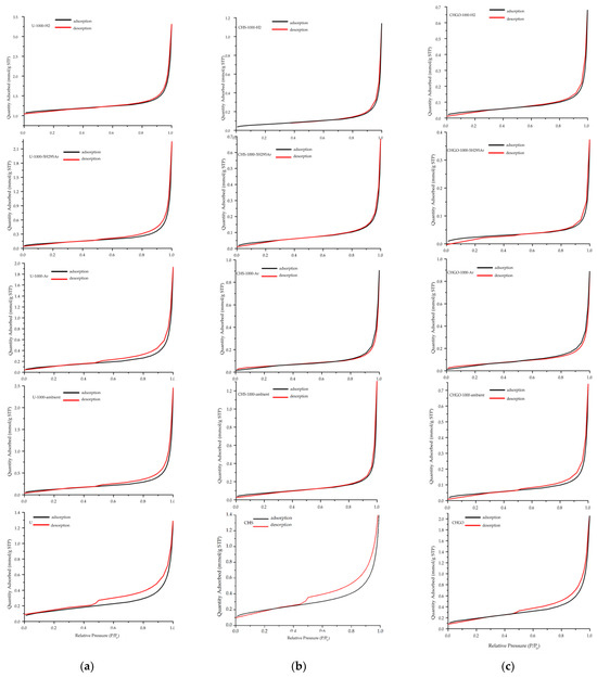 BET isotherms for raw samples and samples treated with in situ heating at 1000 °C in ambient and reduced atmosphere from Uganda (a) and China: CHS (b) and China: CHGO (c). Relative pressure (P/P0).
