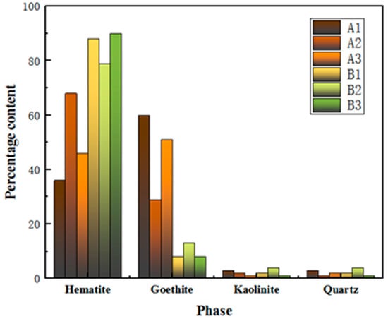 The process mineralogy of three Australian ores and three Brazilian ores is depicted in Figure 1 and Table 3. From the illustration, it is evident that the primary iron-bearing phases in these six iron ores are hematite and goethite. Notably, the content of goethite is significantly higher in Australian ores than in Brazilian ores.
