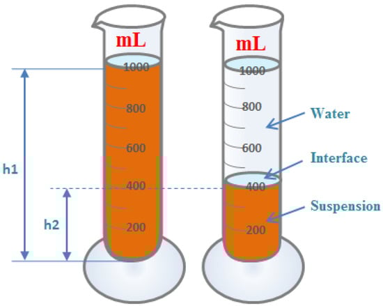 A certain amount of iron ore sample was weighed, and the appropriate amount of water was added. All samples used in the settling experiment were ground to a similar particle size distribution, with 70 per cent of the particles in the slurry smaller than 0.074 mm [7]. The samples used for settling experiments each time had a dry basis weight of 300 g and were pre-mixed to a slurry concentration of about 25% with an initial height of liquid level of about 300 mm. The prepared slurry was poured into a 1000 mL measuring cylinder and shaken evenly. The measuring cylinder was then placed on a horizontal platform, and the real-time settling height (i.e., solid–liquid interface height) of the iron ore vs. settling time was recorded. Recordings were taken every minute for the first 20 min and every 10 min for the subsequent 40 min. A schematic diagram of the experiment on settling characteristics is shown in Figure 2.