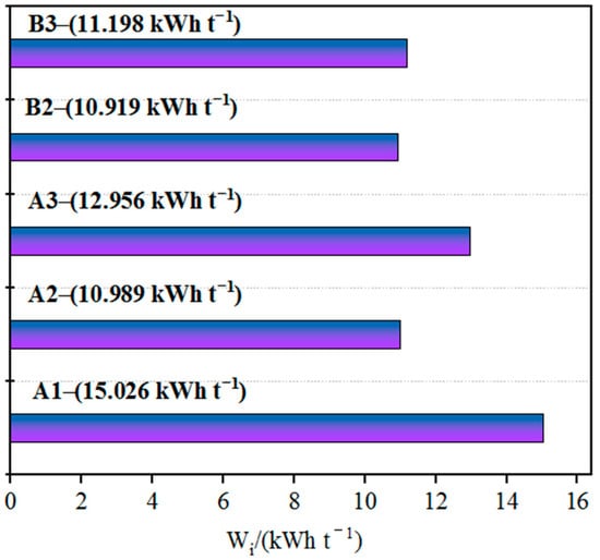 According to the ranking of grindability based on the Bond work index (from high to low, with corresponding energy consumption from low to high), B2 > A2 > B3 > A3 > A1; B2 exhibits good grindability and low grinding energy consumption, while A1 exhibits the poorest grindability and slightly higher grinding energy consumption. All five types of iron ore fines show good grindability, with Bond work indices of about 10–15 kW·h/t; at these values, materials are considered to be relatively easy to grind.