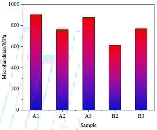 As shown in Figure 3 and Figure 4, the Vickers microhardness of iron ore fines is positively correlated with the Bond work index, and the grindability is largely dependent on the hardness of the iron ore. Sample A1 of iron ore fines has the highest microhardness and the lowest grindability; therefore, a longer grinding time is required to achieve the required grinding fineness. On the other hand, ore sample B1 has the lowest microhardness and the lowest Bond work index among the five samples of iron ore fines, resulting in lower grinding energy consumption.