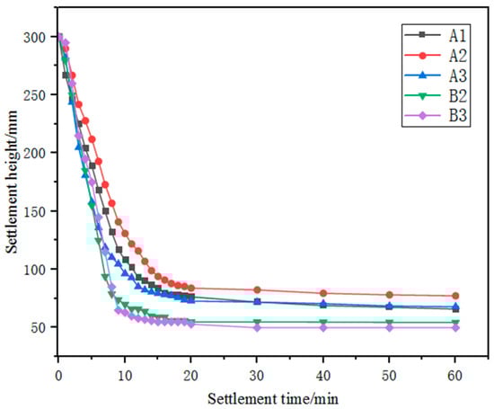The settling performance of the ground iron ores is shown in Figure 5. The static settling process of the slurry can be roughly divided into three stages: in the initial constant settling stage (within about 10–15 min), the particles in the grinding products of the five types of iron ore fines were less affected by the surrounding particles or the tube wall, and the particle spacing was wide. The fine particles underwent intense Brownian motion and collided and aggregated with each other, resulting in fast settling rates of 14.20, 13.40, 14.62, 15.00 and 16.33 cm/min for samples A1, A2, A3, B2 and B3 respectively. In the subsequent 5–10 min, the settling stage transitioned to the interference settling stage, during which the settling rate of the ore particles decreased significantly. After a settling time of more than 20 min, the process transitioned to the compression stage, during which the settling rate was slowest due to the gradual increase in the concentration and viscosity of the sediment layer [22]. According to the Newtonian viscosity law, the drag force on the particles gradually increases, making the particles more susceptible to severe interference from the surrounding particles during settling. Overall, the static settling performance of the three Australian ore fines was poorer than that of the Brazilian ore fines, and a settling time of more than 20 min was required.