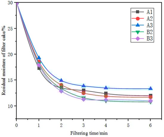 The bottom suspension obtained after settling of the slurry was further subjected to filtration experiments using the XTLZ-260/200 multi-purpose vacuum filter at the Wuhan Prospecting Machinery factory. First, the iron ore fines underwent wet ball milling, and then the corresponding size of finely ground concentrate was prepared at different concentrations. A 70 per cent concentration of the finely ground iron concentrate slurry was filtered under a vacuum of −0.08 MPa, and the suction filtration time was set from 1 to 6 min. After that, the filtering was stopped, and the moisture content of the filter cake was measured.