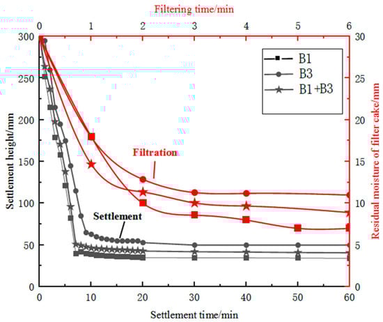 After wet ball milling, the moisture content of sample B3 exceeded 50 per cent and therefore required settlement and filtration treatment. During the wet ball milling of sample B3, the particles underwent lattice deformation and surface defects, resulting in increased surface activity of the particles [24]. The particle size improved after ball milling, and the mass fraction of fine particles increased; the specific surface area also increased, and the hydrophilicity was improved. Additionally, during settlement, highly active kaolin particles produced electrostatic repulsive forces in the aqueous medium, increasing the slurry viscosity and hindering settlement. During filtration, irregularly shaped fine particles in sample B3 filled the pores of the filter cake, reducing its porosity, and the increased hydrophilicity of the finely ground kaolin particles made it difficult to remove moisture from the filter cake. Sample B3 after fine grinding had poor settlement and filtration performance, and it was difficult to obtain a filter cake with a moisture content of less than 10 per cent using existing filtration equipment. Using a large proportion of sample B3 alone was difficult, which affected production efficiency and smooth operation. In contrast, fine specular iron ore concentrate on its own was easy to settle and filter and could achieve a filter cake moisture content of less than 10 per cent in 2 min of filtration time. Therefore, the settlement and filtration performance of finely ground sample B3 was improved by blending it with coarser and regularly shaped sample B1 concentrate. Based on the differences in mineral surface properties, settlement and enhanced filtration technology based on carrier particles with regular particle size, fewer lattice defects and poor surface hydrophilicity could be developed [25]. A comparison of the settlement and filtration performance of single ores and blended ores is represented in Figure 7. The addition of sample B1 concentrate to iron ore slurry was found to reduce both the settlement time and filter-cake moisture content. Increasing the concentration of sample B1 resulted in a reduction of approximately 5 min in the settlement time. By finely grinding sample B3 and blending it with sample B1 concentrate, the filter-cake moisture content could be controlled to below 10 per cent. By intelligently blending materials and controlling the blend of materials, finely ground imported fines suitable for pelletising could be produced. This solved the problem of fine particle pollution of water bodies and the difficulty of achieving the required moisture content of pelletising raw materials, which improved resource utilisation.