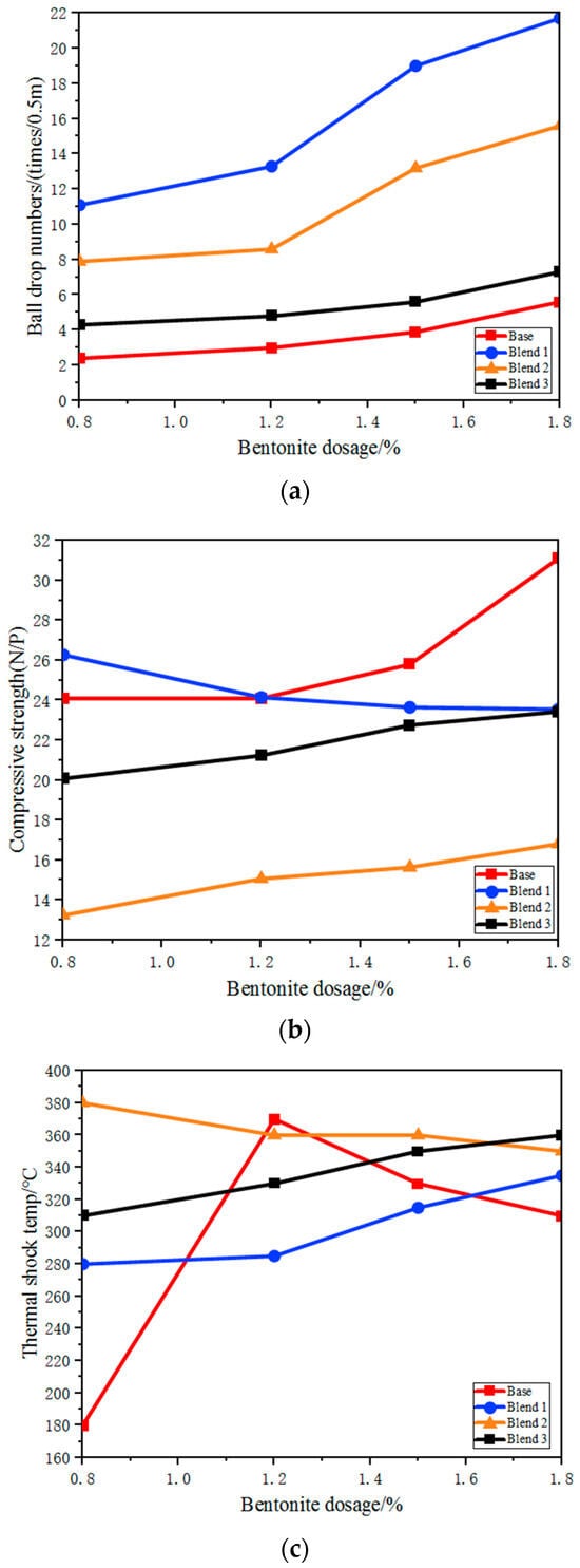 The effect of different bentonite on the performance of green balls. (a) The effect of bentonite dosage on ball drop numbers of green balls with different proportions; (b) The effect of bentonite dosage on compressive strength of green balls with different proportions; (c) The effect of bentonite dosage on thermal shock temperature of green Balls with different proportions.