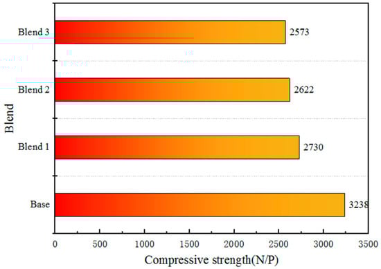 The optimal roasting system after the optimisation of four blends are illustrated in Table 6. The impact of different blends of added Australian ore on the compressive strength of fired pellets is illustrated in Figure 9. From the figure, it can be observed that the Base without added Australian ore, under the condition of roasting temperature at 1200 °C and roasting time of 12 min, still exhibits a compressive strength of over 3200 N per pellet. However, due to its excessively dense structure, this may reduce its reducibility and affect its metallurgical performance. In contrast, for the three blends with added Australian ore, the strength of the pellets can reach 2500 N per pellet, which essentially meets the requirements.