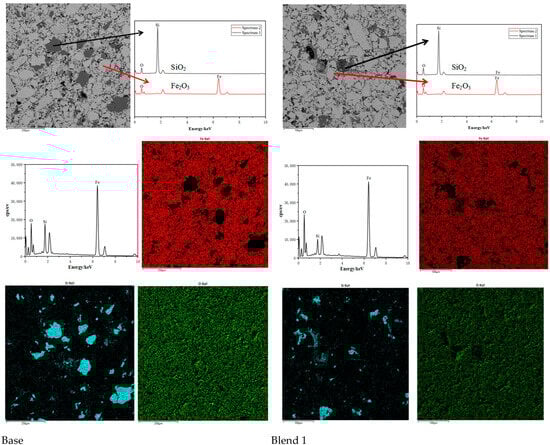 Scanning electron micrographs and Energy Dispersive Spectroscopy of Base and Blend 1. (Si = blue, Fe = red, O = Green).