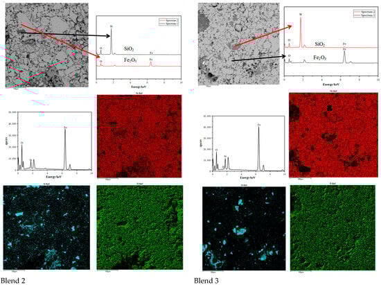 Scanning electron micrographs and Energy Dispersive Spectroscopy of Blend 2 and Blend 3. (Si = blue, Fe = red, O = Green).