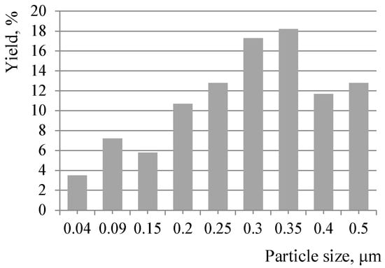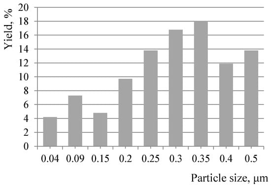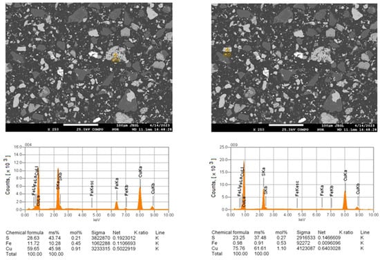 The results of the energy-dispersive spectrometric analysis of the copper minerals at different grinding times in a vibrating micromill (1–3 h) and at 1000× magnification showed that the particle size distribution has several peaks, from 0.04 μm (40 nm) to 0.5 μm (500 nm). The results of the particle distribution histograms for ground chalcopyrite and chalcosine show that the percentage of mineral particles 40–300 nm in size is 46.1% after grinding for 1 h, 51.4% after 2 h of grinding, and 57.3% after 3 h. The percentage of particles 40–300 nm in size is 49.4% in the case of bornite and covellite after grinding for 1 h, 54.2% after 2 h of grinding, and 56.6% after 3 h.
