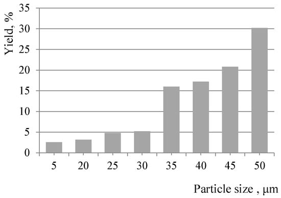 Figure 7 shows the histograms of the particle distribution of ground chalcopyrite (a) and bornite (b), made using the Photocor Compact particle size analyzer. From the figure, it can be seen that, after grinding for 2 h and after dispersion for 3 min, the percentage of bornite and chalcopyrite particles with a size of 300–500 nm is about 60%. In the initial bornite sample, the percentage of particles 40–50 microns in size was 60%–65%. In the initial chalcopyrite sample, the percentage of particles 35–50 microns in size was about 80%.