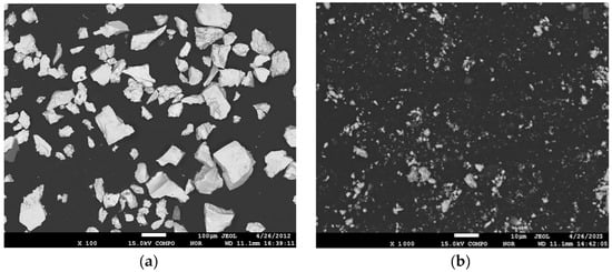Initial (a) and crushed (b) chalcopyrite (CuFeS2) (1000× magnification, secondary electron mode).