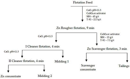 The flotation effect of the novel submicronic sphalerite activators based on copper minerals and copper concentrate was tested on polymetallic ore from a deposit in Kazakhstan containing 0.3% copper, 0.42% lead, and 3.5% zinc. The work flow and reagent mode of the flotation process are presented in Figure 11.