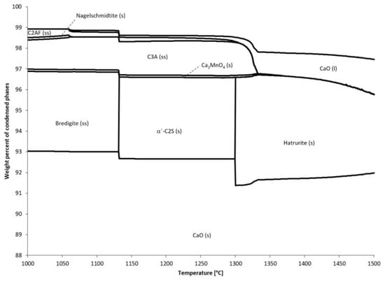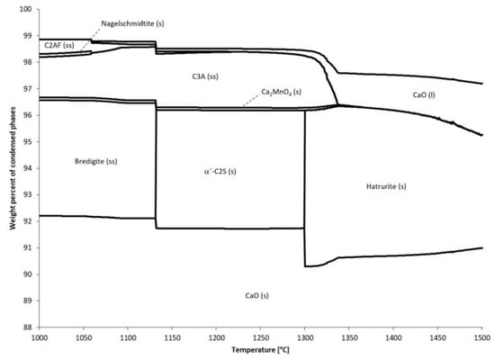 The predicted Ca phases are in accordance with earlier work. Vola detected, by X-ray diffraction, the main phases of calcium oxide (76–96 wt.%), Larnite (0–4 wt.%), Hatrurite (0–2 wt.%), Dicalcium manganate (2–6 wt.%), and Tricalcium aluminate (0–2 wt.%) in laboratory quicklime samples of different limestones cooled from 1050 °C and from 1150 °C [30]. In addition, some samples were reported to contain Gehlenite, Srebrodolskite, Merwinite and Anhydrite. Vola et al. also detected, by X-ray diffraction, the main calcium phases of calcium oxide (56–100 wt.%), Larnite (0–30 wt.%), Hatrurite (0–6 wt.%), Dicalcium manganate (0–3 wt.%), and Tricalcium aluminate (0–5 wt.%) in laboratory quicklime samples of different limestone cooled from 1200 °C [30]. In addition, some samples were reported to contain Gehlenite, Portlandite, and Brownmillerite.