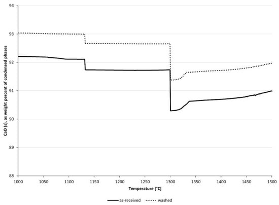 Although the levels of impurities in the surface layers were high, clearly exceeding that of the washed rock, the Ca content of the as-received limestone samples was only marginally reduced (see Table 3). However, the results show that due to the interaction between Ca and the impurities, mainly Si, Al, and Fe as described by Reactions (2)–(6), and Mg and Mn by an unknown reaction mechanism, the CaO (s) content of the quicklime was significantly reduced. To highlight this effect and promote comparison between the as-received and washed samples, Figure 5 and Figure 6 show the quality parameter of interest, CaO (s), extracted from phase diagrams of Ca compounds, seen in Figure 1, Figure 2, Figure 3 and Figure 4, as a function of temperature. For all samples, CaO (s) reached a maximum at a temperature range of 1000–1100 °C. The minimum CaO (s) content was obtained near to the temperature of Hatrurite formation, at 1300 °C. At temperatures exceeding 1300 °C, the phase diagrams, seen in Figure 1, Figure 2, Figure 3 and Figure 4, suggest that the equilibrium gradually shifted toward less Hatrurite and increased amounts of Ca being dissolved into the melt and an increased level of CaO (s). The stability of Hatrurite will depend on the global equilibrium, and it is reported to be 1799 °C in the CaO–SiO2 system used in the calculations [53].