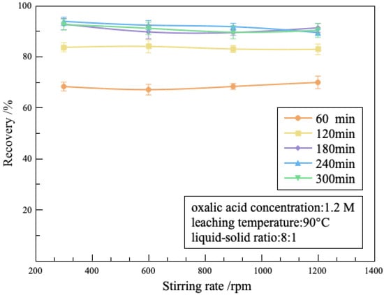 The effect of stirring rate at different leaching times on the lithium recovery from clay minerals is shown in Figure 3, under the conditions of an oxalic acid concentration of 1.2 M, a liquid-to-solid ratio of 8:1, and a leaching temperature of 90 °C. It can be observed that when the stirring rate ranged from 300 rpm to 1200 rpm, the lithium recovery remained stable at approximately 68% at a leaching time of 60 min, and at about 90% at a leaching time of 180 min. Agitation can bring adequate interaction and reaction between the lithium-bearing clay minerals and the oxalic acid solution [14]. Nevertheless, it is indicated that augmenting the stirring speed cannot enhance the leaching rate much, and instead, it led to a greater energy consumption [15]. A stirring speed of 300 rpm can achieve sufficient reaction efficiency. Therefore, the stirring rate is determined to be 300 rpm.