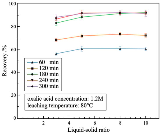Figure 5 illustrates the impact of the liquid–solid ratio on the lithium recovery during leaching process. It is evident that the lithium recovery exhibited a general upward trend with increasing liquid–solid ratio, and kept steady when the liquid–solid ratio was more than 5:1. The lithium recovery reached to 91.35% under the optimal condition of liquid–solid ratio of 8:1 and leaching time of 180 min. Moreover, increasing the liquid–solid ratio can effectively shorten the equilibrium time for lithium recovery. Since elevating the liquid–solid ratio promotes the dissolution of lithium from clay ore, offering ample reaction space for interaction with oxalic acid and improving the rate of lithium leaching [17]. Nonetheless, excessively high liquid–solid ratios can yield a barely significant improvement in the lithium recovery and result in additional wastage of the oxalic acid. Therefore, the optimal liquid–solid ratio was determined to be 8:1.