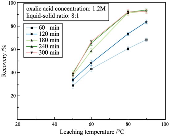 The effect of leaching temperature at different leaching times on the lithium recovery is shown in Figure 6. The lithium recovery exhibited a direct correlation with increasing leaching temperature. The lithium recovery rose rapidly with the increase in leaching temperature. In particular, the rise in leaching temperature could enhance the leaching efficiency. At leaching temperatures of 50 °C and 60 °C, the lithium recovery after 180 min of leaching time reached between 37.61% and 58.87%, respectively. Further increasing leaching temperature to more than 80 °C, the lithium recovery significantly elevated and then remained stable. This is probably because the temperature during the leaching process typically influenced both the rate of the leaching reaction and the rate of diffusion [18]. As the temperature rose, the energy associated with particle agglomeration also increased, thereby improving the capacity to disrupt or attenuate the crystal lattice within the mineral [19]. This resulted in a greater number of molecules possessing kinetic energy that met or surpassed the threshold of the activation energy, consequently accelerating the leaching process and improving the rate of lithium extraction per unit of time [20]. Furthermore, a rise in temperature led to an increased molecular thermal motion rate, which, in turn, quickened the dissociation of oxalic acid. This process facilitated a greater exchange of H+ ions with Li+ ions within the lithium-bearing clay minerals, effectively extracting Li+ from the silicate layers. Therefore, the temperature of 80 °C was selected as the optimal condition, at which the lithium recovery could reach to 91.35%.