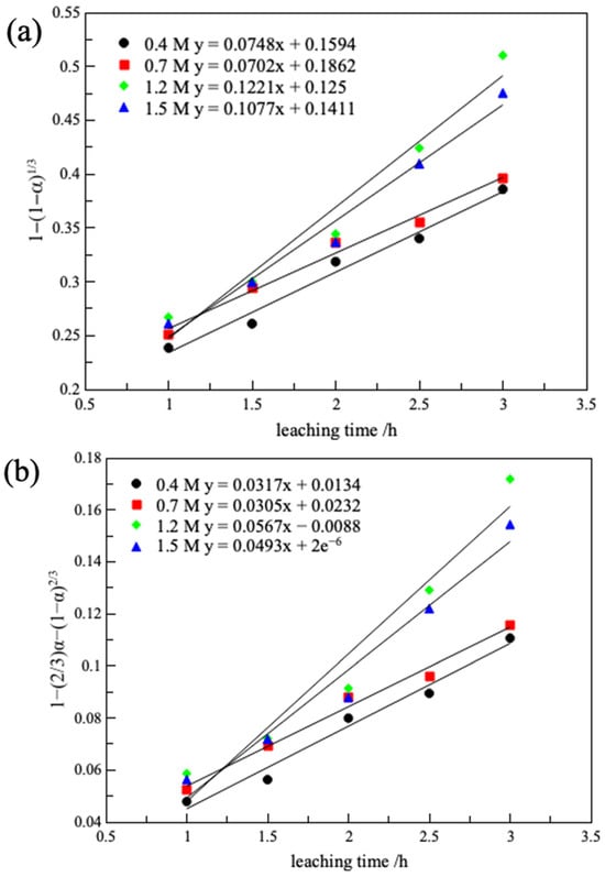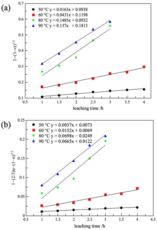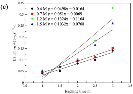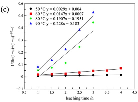 in which α represents the lithium leaching rate (η (%)), t is the leaching time (h), and   k 1 , k 2 ,   k 3 are all rate control constants.