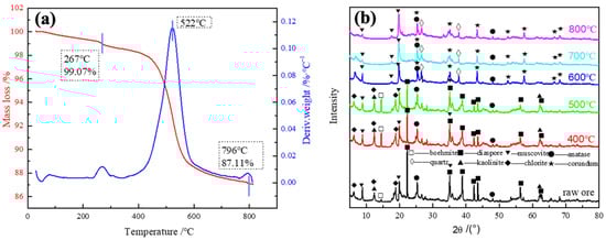 The thermal properties of the lithium-bearing clay minerals and phase transformation during the calcination process at various temperatures of the lithium-bearing clay mineral were investigated using the DTA-TGA (Figure 9a) and XRD analysis (Figure 9b). As shown in Figure 9a, the initial mass loss of about 1% occurred at around 77 °C, which can probably be attributed to the removal of adsorbed water from the clay mineral [21]. The clay mineral underwent a considerable weight reduction in the temperature range of 400 °C to 600 °C, exhibiting the most substantial rate of weight loss at 522 °C [22]. The substantial mass loss of 10% at 522 °C was associated with the release of structural water from the interlayers [21]. And then the interlayer cations migrated to the vacant positions created by -OH groups to satisfy their coordination requirements [23]. A total weight loss reached 12.89% at 796 °C. As shown in Figure 9b, the phases composition of the samples calcined at 400 °C and 500 °C remained relatively unchanged compared with the raw ores, involving chlorite, boehmite, kaolinite, diaspore, and muscovite. As the calcination temperature increased to 600 °C, the peak intensity for kaolinite, boehmite, and diaspore diminished, accompanied by the formation of corundum, quartz, and muscovite. This may result from the solid phase transformation during the calcination process, according to Equation (8).