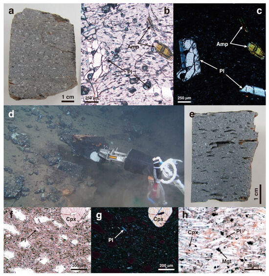 Analyzed rock samples. (a–c) Polished slab (a) and photomicrographs (b,c) of the analyzed rhyolite. (b) (opened nicols) and (c) (crossed nicols) show the same field of view. Pl: plagioclase; Amp: amphibole. (d–h) Sampling photo by ROV Hyper Dolphin 3000 (d), polished slab (e), and photomicrographs (f–h) of the analyzed andesite. (f) (opened nicols) and (g) (crossed nicols) show the same field of view. Cpx: clinopyroxene; Mgt: magnetite. In (h), elongated plagioclase and clinopyroxene crystals with flow texture and volcanic glass (brown areas) are observed.