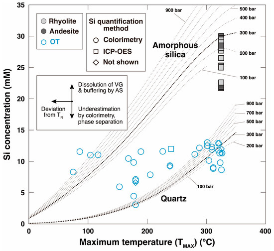 The maximum temperature (TMAX) of the observed fluid and the Si concentration in estimated endmember fluids in the hydrothermal fields in the Okinawa Trough (OT), with the solubility curve of quartz and of amorphous silica at 100–900 bar (dashed). Potential biases/effects on each point are shown in the inlet. TR: temperature at the reaction zone; VG: volcanic glass; AS: amorphous silica. The present experimental results are also shown for comparison. The Si concentration in most fluids (especially with TMAX < 250 °C) is apparently too high to be explained by the equilibrium with quartz. References for the compilation are listed in the Supplementary Information (Table S1, [37,38,39,40,41,42,43,44,45,46,47,48,49,50,51]).