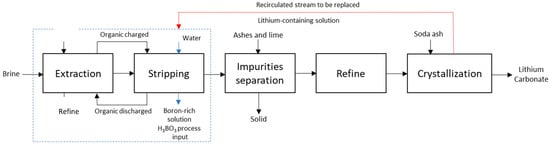In the lithium carbonate process, boron found in the brines of the Salar de Atacama is extracted during the solvent extraction stage to prevent it from becoming an impurity. At the SQM company, a stream is recirculated from the separation stage to extract boron [10,11].
