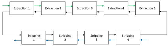 Extraction and re-extraction stages of the current process to obtain lithium carbonate. Brine stream (green), organic stream (black), mother liquor (blue).