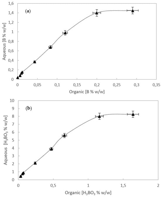 Stripping isotherms: (a) boron in water versus boron in the organic phase; (b) H3BO3 in water versus H3BO3 in the organic phase. The pH of the feed solution was 0.21 and tests were performed at room temperature (~25 °C). Data points and error bars are means and standard deviations, respectively, from duplicate experiments.