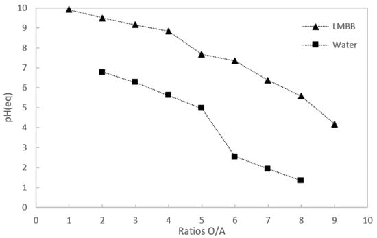 Working with high O/A or A/O ratios leads to the use of a larger volume of solution within the process, larger reactors and a longer residence time, which slows down the stripping stage, resulting in a low concentration of boric acid [14]. By decreasing the O/A ratio using water as the stripping agent, the operating pH(eq) remains basic, base separation times are reduced and high concentrations of boric acid are obtained.