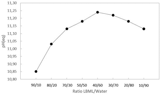 The equilibrium pH values of the aqueous mixtures (LBML and water) were also measured. There was a clear increase in pH(eq) up to a ratio of 40/60, after which it began to decrease, as shown in Figure 6. This again indicates the predominance of certain chemical species as a function of the concentration.