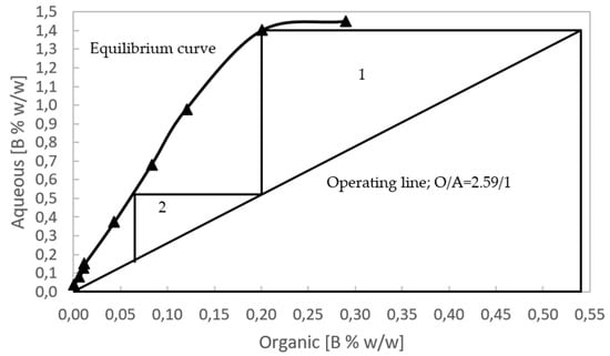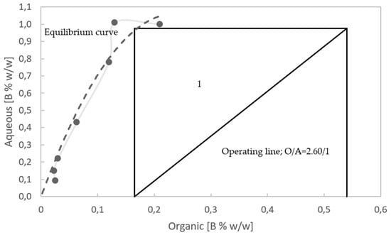 Figure 8 shows the McCabe–Thiele diagram with water as the aqueous phase. When the horizontal line from the operating straight line intercepts the stripping isotherm, one stage is obtained. Figure S2 in the Supplementary Material shows the countercurrent process; a loaded organic (LO) phase enters with 0.54 % w/w B and an unloaded organic (UO) exits with 0.165 % w/w B, while freshwater enters with a concentration of 0 % w/w B and exits with a concentration of 0.975 % w/w B. The slope of the operating straight line (O/A ratio) is 2.60.