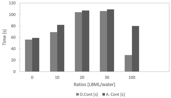 Figure 9 shows the phase separation time in organic continuity (O. Cont) and aqueous continuity (A. Cont) for the pure aqueous solutions (water and LBML), as well as for the mixtures with LBML/water ratios of 10/90, 20/80 and 30/70.