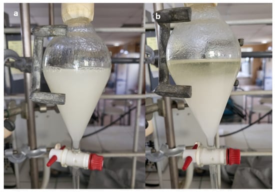 A ratio of 2.6 to 1 between the loaded organic phase and water (the aqueous phase) was chosen to load the aqueous phase to the maximum capacity. In the first stage, the phases managed to separate without any difficulty, with a time of 56 s, but phase separation did not happen in the second stage because an emulsion formed. This stage was maintained for 72 h so that phase separation could be completed, but the phases only managed to separate by a few centimeters (Figure 10).