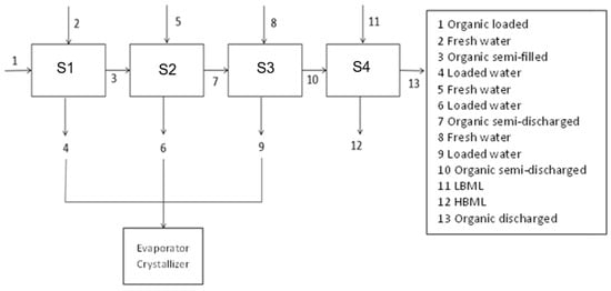 The operating temperature is 22–23 °C (depending on the season), while the equilibrium pH varies between 2.85 and 2.96. The average operational concentrations of H3BO3 in the primary process streams are as follows: organics loaded = 2.288%, organics discharged = 0.004%. The boron concentration at the inlet of the extraction process ranges from 5138 to 8059 mg/L, while the outlet concentration in the refining process is 29.6–31.0 mg/L. The LBML has a concentration of 0.003% and the high-boron mother liquor (HBML) has a concentration of 3.95%. The organic flow rate ranges from 33 to 44 m3/h, the brine flow rate ranges from 16 to 19.5 m3/h and the mother liquor flow rate ranges from 17 to 19 m3/h. To quantify the extraction, measurements were conducted using inductively coupled plasma and optical emission spectroscopy (ICP-OES) in the LBML and in the loaded organic phase, which were subsequently transformed into the HBML and unloaded organic phase, respectively. Figure 2 shows the flow of the streams in the extraction and stripping processes.
