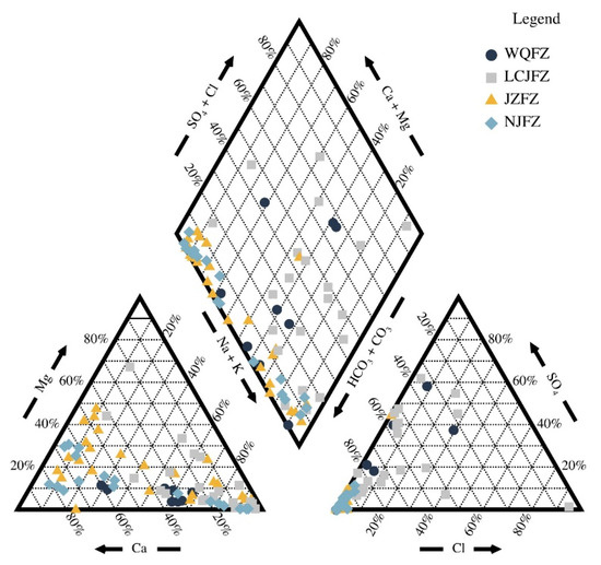 A box plot and Piper diagram were constructed to visually represent the physicochemical parameters and concentrations of major ions (K+, Na+, Ca2+, Mg2+, Cl−, SO42−, and HCO3−) in the springs, as shown in Figure 2 and Figure 3. In the Piper diagram, the main ions in the JZFZ and NJFZ are Na+, Ca2+, and HCO3−. The main cations of spring water samples in the WQFZ and LCJFZ were Na+, while the main anions were HCO3− and SO42−. According to the Shchukarev classification, the spring water samples collected along the JZFZ and NJFZ predominantly fall into the Na-HCO3 and Ca-Mg-HCO3 types. Conversely, within the WQFZ and LCJFZ, the water demonstrates primarily Ca-Na-HCO3-SO4, Ca-Mg-SO4, and Na-Cl-SO4 types.