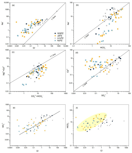 Relationships of major ions of the spring water in the TRLCZ. (a) Na+ vs. Cl−; (b) HCO3− vs. Na+; (c) (Ca2+ + Mg2+) vs. (CO32−+ HCO3−); (d) SO42− vs. Ca2+; (e) Cl− vs. SO42-; and (f) Cl− vs. HCO3−.