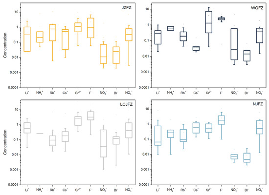 To analyse the differences in the contents of Li+, NH4+, Rb+, Cs+, Sr2+, F−, NO2−, Br−, and NO3− ions in thermal springs along JZFZ, WQFZ, LCJFZ, and NJFZ, a box plot was created, as shown in Figure 5. Ammonium is an important parameter of geothermal fluids and high NH4+ value indicates that there may be input from anthropogenic sources. The presence of NH4+, NO3−, and NO2− can indicate the degree of groundwater contamination by surface water. Typically, deep groundwater has little to no NO3− present, whereas the presence of NH4+ and NO2− indicates that the groundwater may have recently been contaminated. The content of NO3−, NH4+, and NO2− near the WQFZ had slightly higher values than those of the JZFZ, LCJFZ, and NJFZ. This observation suggests that the circulation depth of springs in the WQFZ region is relatively shallow, making them more susceptible to mixing with shallow groundwater. Li+ is a highly active element that is easily enriched in thermal spring water and is the signature element of deep liquid upwelling [69]. Li+ is relatively enriched in samples J14, J21, L41, L42, L43, N64, N71, N72, and N73, where volcanic rocks were found in certain amounts. Rb+ and Cs+ are typical postmagmatic components and indicate the involvement of magmatic sources. The Rb+ and Cs+ concentrations of samples J12, J14, J15, J16, J18, L41, N68, and N71 are significantly higher than those of other samples and are closely related to the distribution of volcanic rocks. The study area features the development of carbonate and clastic components, with the majority of springs exhibiting weak alkalinity. Due to the propensity for F− and Sr2+ to accumulate in weak alkaline water, the concentrations of F− and Sr2+ in the water bodies of the study region are relatively high [70,71].