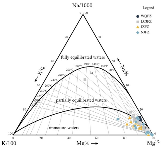 Traditionally, cation ratio geothermometers—such as Na-K, Na-K-Ca, and K-Mg geothermometers—and SiO2 geothermometers are employed to estimate geothermal reservoir temperatures. The water–rock equilibrium state of thermal water is often visualised using the Na-K-Mg triangular diagram, categorizing spring waters into three types: fully equilibrated waters, partially equilibrated waters, and immature waters [72]. Only fully equilibrated waters can be reliably used with cation geothermometers to estimate geothermal reservoir temperatures. In Figure 6, most data points are situated in the area representing immature water, which is evident in the thermal springs plot. Sample No. L41 is positioned in the partially equilibrated area of the triangular diagram, indicating that the wall rock has not achieved equilibrium, likely due to the influx of a significant quantity of cold water (shallow groundwater). This suggests that cation geothermometers may not be suitable for calculating reservoir temperatures in the study area.