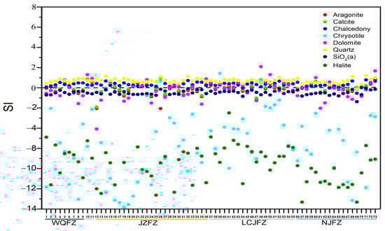 When analysing the geothermal spring water samples, mineral saturation indices (SI) were calculated using the PHREEQC software; the results are visually represented in Figure 7. The SI variations for chrysotiles and halites in each spring water sample are notably diverse. The majority of spring water samples predominantly exhibit an unsaturated state (SI < 0) concerning SiO2 (a), suggesting that amorphous silica does not primarily control the SiO2 content in the solution. In contrast, chalcedony and quartz approach equilibrium (SI ≈ 0), with chalcedony exhibiting closer proximity to the saturation line than quartz. Fluctuations above and below the nearby equilibrium line for dolomite, aragonite, and calcite indicate variations in the characteristics of the surrounding rock. This phenomenon may signify higher mineral content and extended residence time in the aquifer system [73], as indicated by saturation. Conversely, an unsaturated state suggests that minerals are relatively soluble or have insufficient reaction time with thermal water. These nuanced variations highlight the intricate and complex nature of mineral–water interactions within the studied geothermal springs.