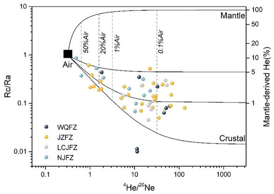 Helium has two stable isotopes with mass numbers 3 and 4. 3He mainly escapes from the mantle. A large portion of 3He is primordial He, which was trapped in the solid earth at the time of accretion [77]. A small portion of 3He is produced by the nuclear reaction of 6 Li (n, α) 3H (−1 β) 3He. Decaying crustal U and Th predominantly produce 4He [78]. An R/Ra versus 4He/20Ne diagram was used to identify the origin of the He in the TRLCZ (Figure 8). The He isotopic compositions of the air, MORB, and crust are already well established [79]. By assuming R/Ra and 4He/20Ne ratios of 0.02 and 1000, 1 and 0.318, and 8 and 1000 for the crust, air, and MORB-type mantle, respectively, the mixing proportions were estimated using Sano and Wakita’s [79] equations. The boundary lines of this model are calculated using the following mass balance equations: