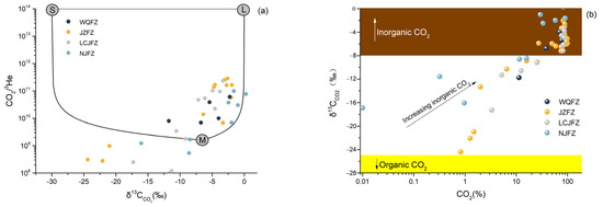 The mantle-derived δ13CCO2 concentration ranges from −8‰ to −4‰ [95], and that from limestone thermometamorphism is ±2‰ [96]. Mantle-derived CO2 can exhibit strong variation in its isotopic composition (δ13CCO2 = 0‰ to −8‰), mainly due to the variable mixing of mantle-derived CO2 and crustal contributions [97,98]. Organic CO2 is typically characterised by a strongly negative carbon isotopic signature from −70 to −25‰ [99]. A CO2/3He-δ13C mixing model based on the methodology proposed by Sano and Marty [100], and a plot of δ13C (‰) vs. CO2, were employed to improve the identification of mixing processes. Most samples generally fell on a binary mixing line between the mantle and limestone endmembers (Figure 9a), suggesting the possible addition of mantle-derived CO2 to the sampled geothermal fluids. As shown in Figure 9b, the increase in CO2 content was accompanied by 13C isotope enrichment. Further, carbonate-rich rocks are widespread in this area. Crustal limestone could serve as the primary source for these CO2-rich samples, exhibiting high δ13CCO2 values, ranging from −1.6‰ to −7.2‰, at the top right of Figure 9b. Considering our previous discussion suggesting that the higher 3He/4He values in the research area might be the result of minor additions of mantle helium, it is reasonable to consider that trace amounts of mantle CO2 could also contribute to the geothermal volatiles in the TRLCZ.
