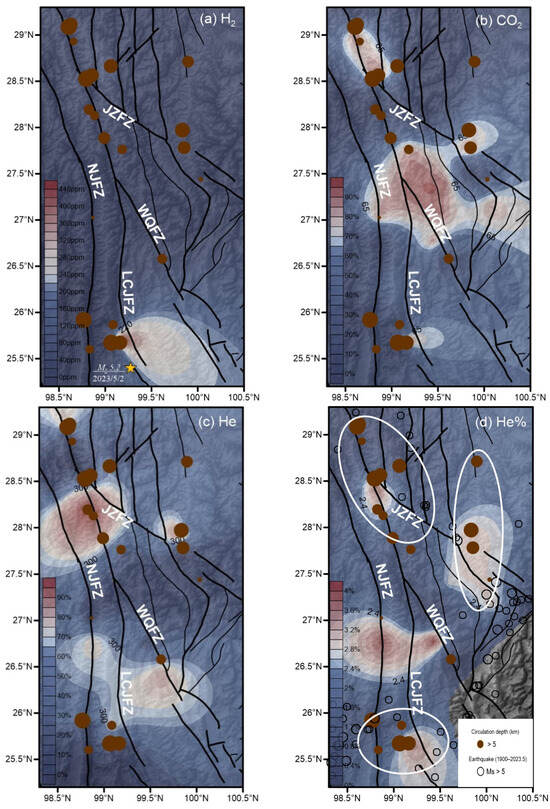 Figure 10 shows the spatial distribution of the H2 concentration, the CO2 concentration, the He concentration, and mantle He proportions in gases emitted from the four faults of the TRLCF. A comparison of the spatial distribution of hydrogeochemical characteristics (H2, CO2, He, and mantle He %) and the circulation depth of thermal springs in the different faults shows that there is a positive correlation between the emission of He that has traversed the crust and the circulation depth (higher values of concentrations of He and mantle He% always occur near the sampling points with deeper circulation depths; Figure 10c,d). However, no such correlation existed between the emission of H2 and CO2. A high concentration region of H2 in the southern segment of the LCJFZ roughly corresponds to a higher circulation depth (Figure 10a). However, no such consistent pattern is observed for the JZFZ, WQFZ, and NJFZ. The elevated concentration of H2 in the fracture zones is consistent with the idea that H2 is generated by radical reactions between H2O and Si-O or Si- radicals, which appear on the fresh surfaces of fractured rocks [104]. The more active the fracture zone is, the more developed the fresh rupture surface of silicate rock in the fracture zone, and the more H2 is produced [105]. Interestingly, the recent 2023 Baoshan M 5.2 earthquake occurred in the range of an anomalous area with high concentrations of H2 release (Figure 10a). This implies that, in the monitoring of earthquake precursors, the measurement of hydrogen gas content could potentially serve as a favourable geochemical surface observation method.