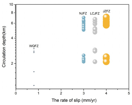 The kriging spatial interpolation method in Surfer13.0 (Surface Mapping System, Golden Software, Inc, Golden, CO, USA) was used to draw contour maps of the gas contents (H2, CO2, He, and mantle He %) of sampling sites in order to expound the spatial discrepancies in thermal waters from the study area (Figure 10). According to Figure 10, the geothermal system in the TRLCF is significantly influenced by the underlying structural characteristics. This influence is evident as the majority of thermal springs are located along four active NS-trending normal and strike-slip crustal faults. The presence of faults and fractures provides pathways for pressured fluids and gases to migrate towards the surface. Figure 11 demonstrates a positive correlation between the depth of circulation and fault activity. In our research area, the JZFZ exhibits a considerably higher average slip rate (~4 mm/a or 5–7 mm/a) compared to the WQFZ (0.89 mm/a or 1.8–2.4 mm/a) [30,35,36,37,38,53]. The average circulation depth of thermal spring water along the JZFZ is 4 km, which is relatively deep. Conversely, the northern segment of the WQFZ has the shallowest circulation depth of thermal spring water (ranging from 1 to 3 km, excluding a maximum value of 6 km). The fracture junctions of the LCJFZ with the JZFZ exhibit higher circulation depths of thermal spring water, ranging from 4 to 7 km. The circulation depth of thermal spring water along the southern segments of the NJFZ surpasses that of the northern segments, with depths ranging from 5 to 7 km and 2 to 3 km, respectively. The strike-slip rates of the LCJFZ and NJFZ are approximately ~3 mm/a [31,32,33,34]. Additionally, based on earthquake observation since 2009, it is evident that the frequency of Ms ≥ 4 earthquakes is notably higher in active fault zones (JZFZ), where thermal springs have deeper groundwater circulation (as shown in Figure 11). In the structural junction areas, such as the fracture junctions of the LCJFZ with the JZFZ, where the fluid circulation depth is relatively deep, there is a higher propensity for seismic activity, as illustrated in Figure 10d and Figure 11. This observation suggests a close relationship between underground fluids and the seismogenic process in the study area. Deeper circulation depths correspond to more intense water–rock reactions. The seepage of groundwater into the deeper layers increases pore fluid pressure, intensifies the interactions between water and rock, weakens fault zones, and enhances earthquake susceptibility [101,102,103]. Therefore, it is crucial to further investigate seismic activity in areas with deep geothermal water circulation.