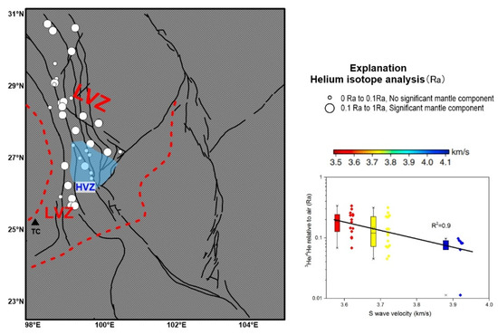 3He/4He values, reported relative to air, from thermal springs and cold springs within the study region are overlaid on S-wave mantle tomography in the upper mantle (modified from Wang et al. [40]; Fu et al. [92]). Inset shows the correlation (R2 = 0.9) of 3He/4He in each velocity bin relative to the mantle S-wave velocity (Wang et al. [40]).
