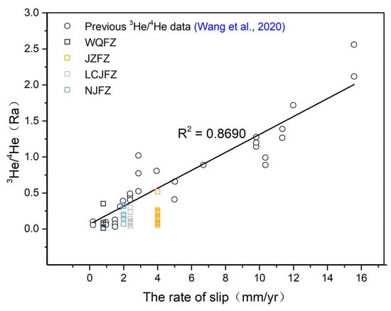 Correlation between the 3He/4He ratios (Ra) and strike−slip rates (mm/a) (modified from Wang et al. [108]).