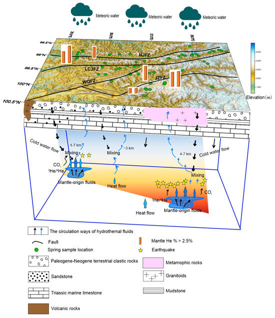 Figure 14 illustrates the fluid circulation model governing groundwater migration and deep mass transfer in the TRLCZ. Meteoric water infiltrates fractured metamorphic and clastic rocks within high mountainous regions to be heated as thermal water. The prevalence of a thick red mudstone layer, serving as the cover for the geothermal system, contributes to poor permeability, fostering heat accumulation during groundwater movement [114]. The existence of prevalent NW- and NE-trending fault systems, coupled with intense seismic activities, fractures the outcropped rocks in these regions. Consequently, meteoric water easily percolates in the depths through structurally weak zones. As discussed in Section 5.1, the chemo-diversity of the studied geothermal water is constrained by the characteristics of host rocks and the extent of water–rock interactions. Their evolution appears to be controlled by specific tectonic units. For instance, spring water samples collected along the JZFZ have Na-HCO3 and Ca-Mg-HCO3 compositions, respectively. In contrast, within the WQFZ (located in the Lanping Basin), the water changes to the Ca-Na-HCO3-SO4 and Na-SO4 types. This characteristic shift is indicative of increased interaction with carbonate-contained aquifers during the water’s flow from northern mountain regions to southern basins. This characteristic change is also associated with the diverse lithology of aquifers, with the JZFZ predominantly composed of resistant high-grade metamorphic rocks and the WQFZ containing limestone, red-coloured terrestrial siliciclastic rocks, gypsum, and halite.