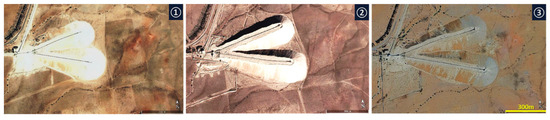 Spatial evolution of Ben Guerir’s screening PMWR stockpile. ①: July 2004—②: August 2014—③: April 2023 (Google Earths).