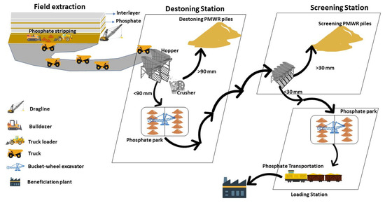 At the Benguerir mine site, ore extraction is accomplished via open pit mining, which entails removing overburden and excavating ore from the surface. This intermittent method of ore extraction by trenching usually involves the utilization of heavy machinery like excavators, bulldozers, and trucks to remove rock and soil above the mineralized layers (ore body). After exposing the ore, it is drilled, blasted, and loaded onto trucks to be transported to a processing plant (Figure 2), where it is screened, crushed, and subjected to a series of physical processes to isolate the phosphate from other materials.
