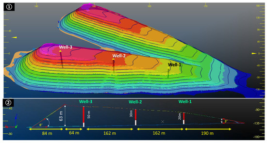 Arrangement of stockpiles and location of sampling wells; Legend: ① Perspective view (3D view) of the left arm of the screening PMWR stockpile; with the location of the three mining wells. It is noted that the well implantation mesh is around 162 m. ② Projection of the three wells on a longitudinal section representing the planned sampling depths by mining wells respectively (Well-1, 20 m, Well-2, 30 m, and Well-3, 50 m).