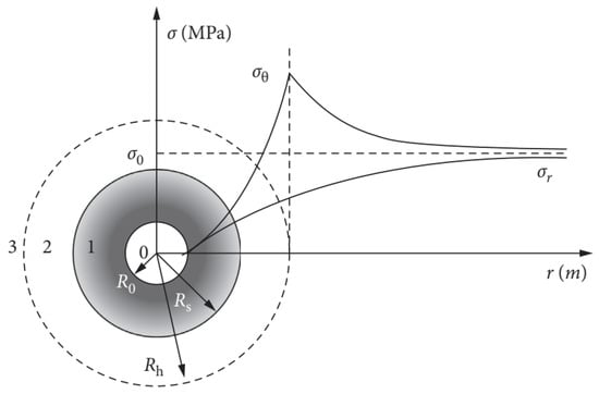 Stress distribution diagram of elastic-plastic zones of a well [27]; Legend: R0: Radius of the well; Rs: Radius of plastic softening zone; Rh: Radius of the hardening zone, 1: Plastic softening zone; 2: Plastic hardening zone; 3: The elastic zone.